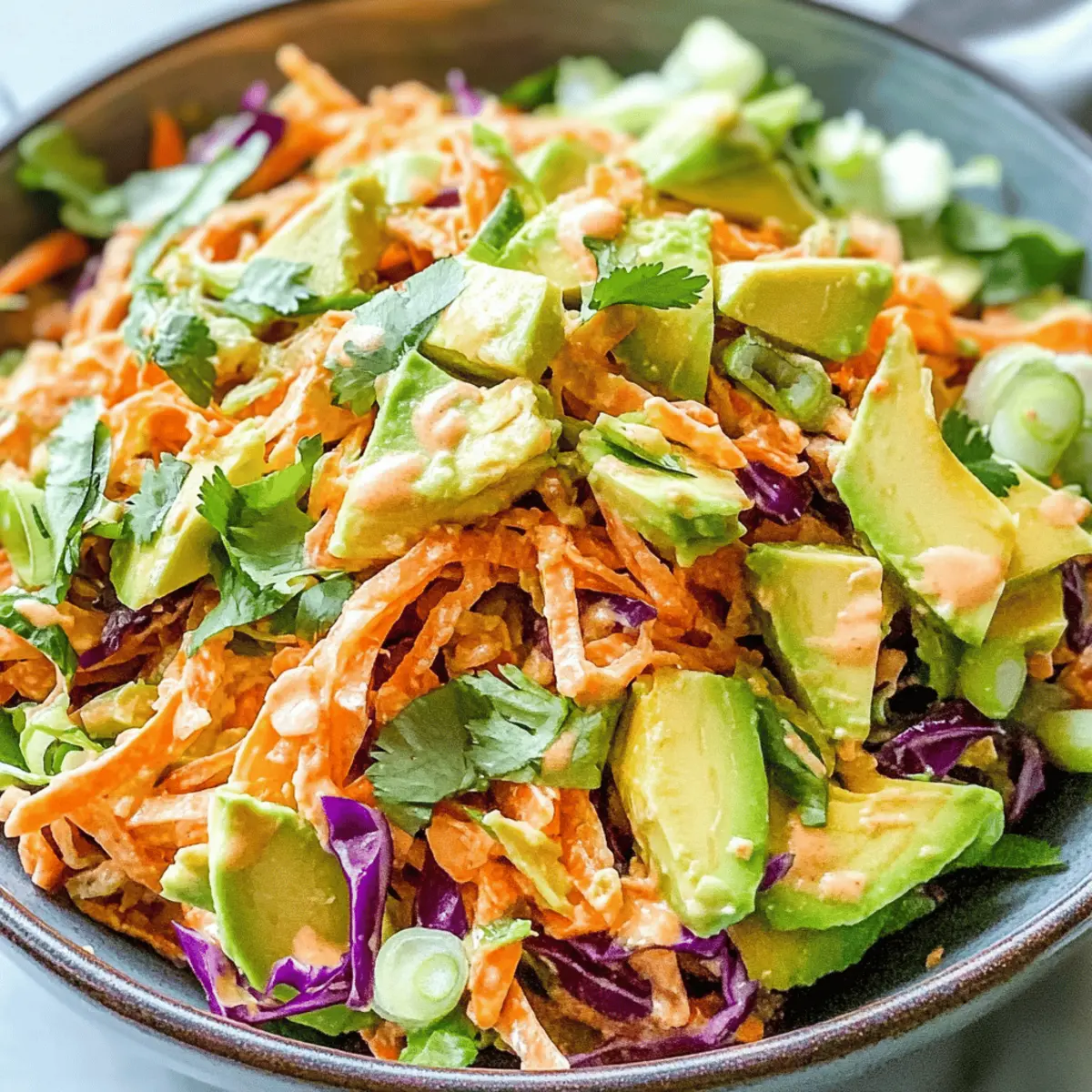 These Vibrant Shredded Thai Salad with Avocado components are perfect for meal prep enthusiasts! You can prepare the shredded vegetables (cabbage, carrots, bell pepper, and green onions) up to three days in advance. Simply store them separately in airtight containers in the refrigerator to maintain their crunch. The dressing can also be made ahead and refrigerated for up to 5 days—just give it a quick stir before using. When it’s time to serve, gently combine the prepped veggies and dressing, then fold in the avocado (add it last to prevent browning) for fresh, creamy flavor. This way, you’ll have a delightful, ready-to-eat salad with minimal effort on busy weeknights!